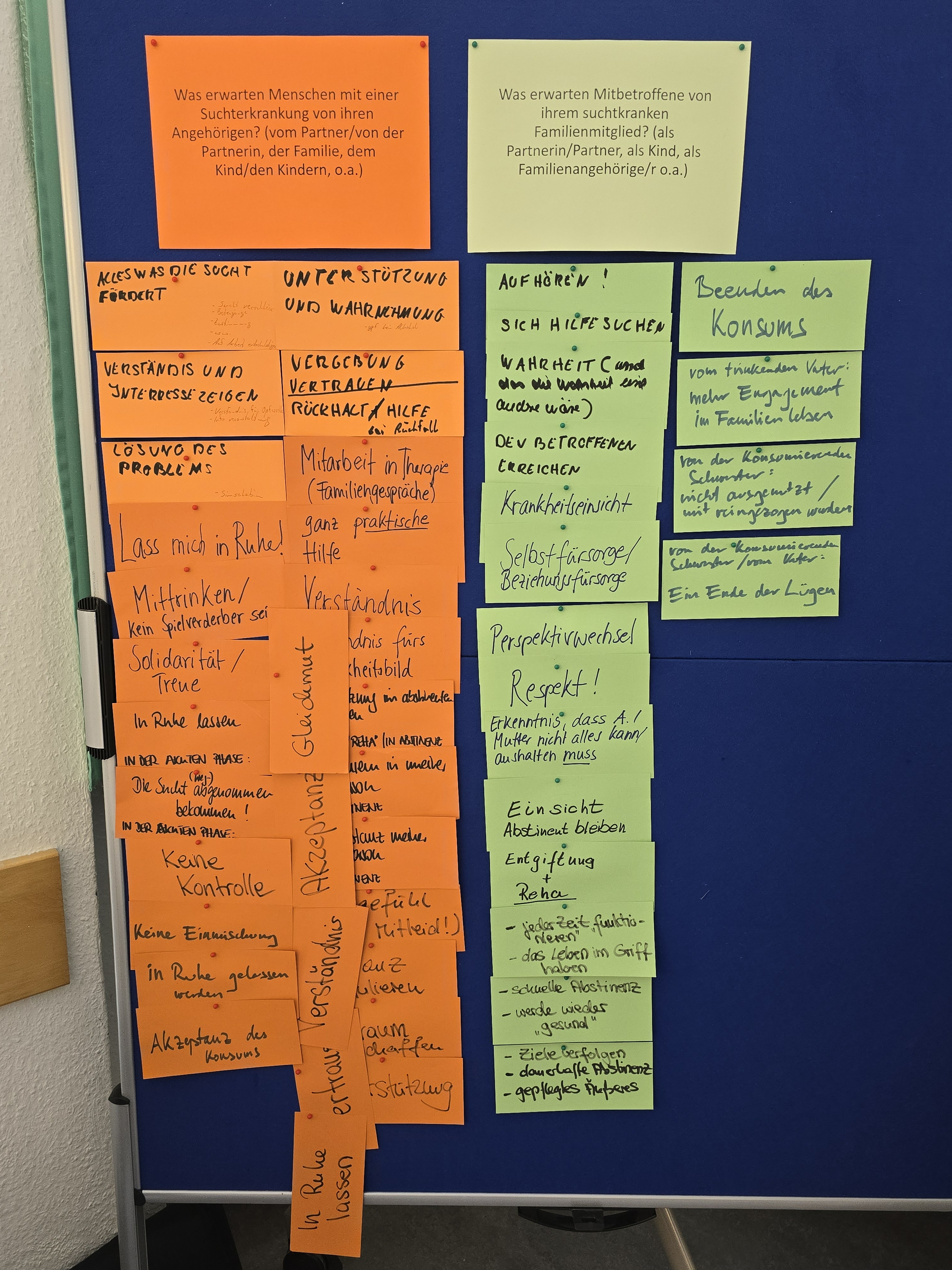 Dann lud uns Suchttherapeutin Ulrike Bergner-Schmitt zum Perspektivwechsel ein: Im Workshop ‚Sucht und Angehörige‘ reflektierten wir unsere eigene Position innerhalb suchtgeprägter Familiengefüge und formulierten Erwartungen der Suchtkranken an ihre Angehörigen und umgedreht. Wir erhielten theoriebasierte Einblicke in die Phasen der Veränderung, identifizierten Schnittmengen und Begegnungsmöglichkeiten, aber auch tiefe Gräben und Grenzen. Die hoch emotionale Betroffenheit auf beiden Seiten verstand die Referentin einfühlsam und kompetent aufzufangen, wobei wir uns alle eine Vertiefung gewünscht hätten, da viele der provozierten Fragen offenbleiben mussten. Wie wichtig und verstörend das Verständnis für die systemischen Verstrickungen ist, zeigten auch die individuellen Gespräche, die noch weit über das Abendessen hinausreichten. |